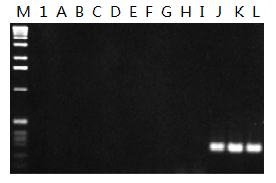 △Fig 1.使用FailSafe? PCR PreMix Selection Kit擴增高GC含量的模板。擴增人的ApoE gene中GC含量為75%的片段,M:molecular marker;1:使用MasterAmp Taq DNA聚合酶的標準緩沖液條件;A-L:使用12 種FailSafe 2X PCR PreMix 分別進行擴增。